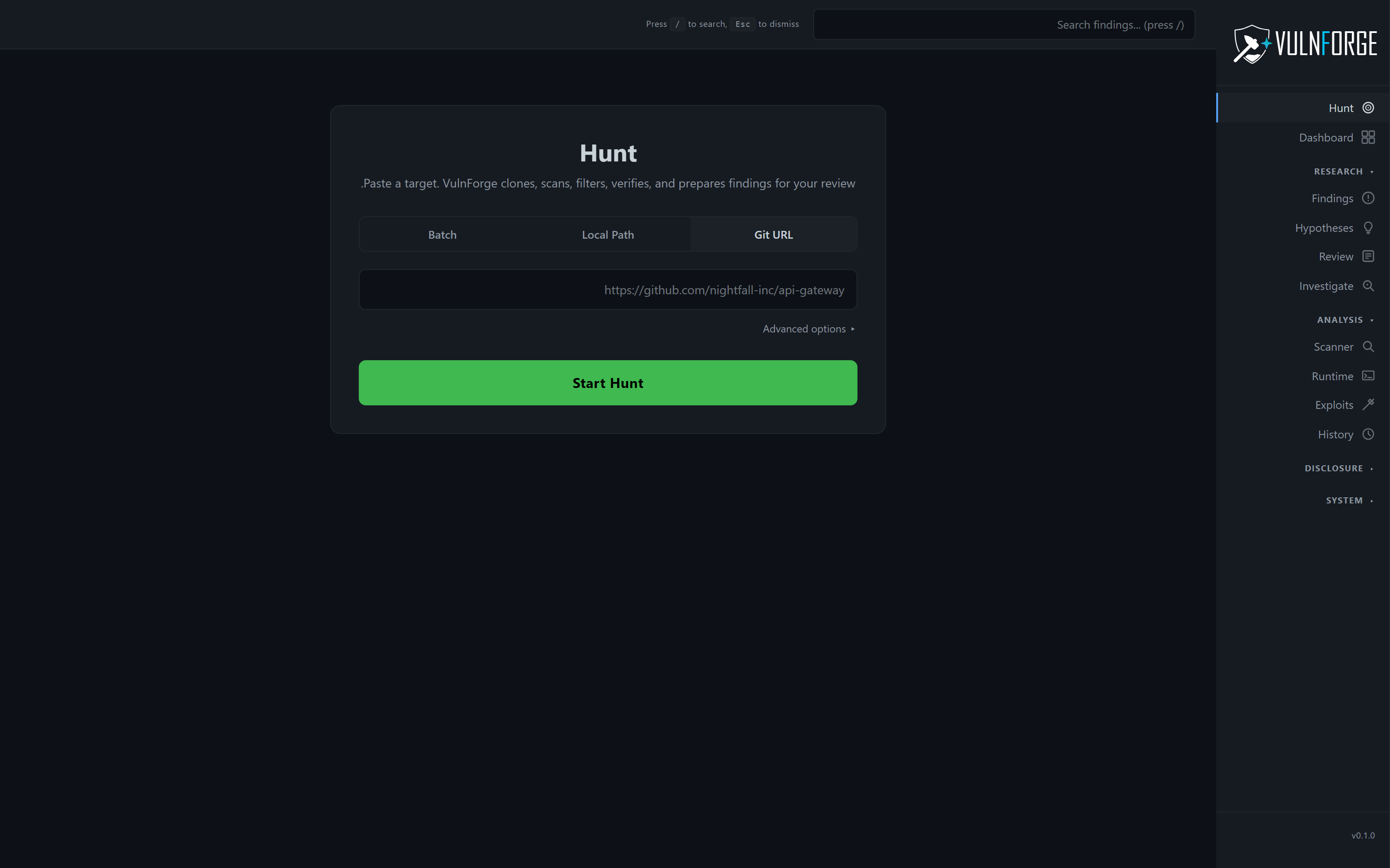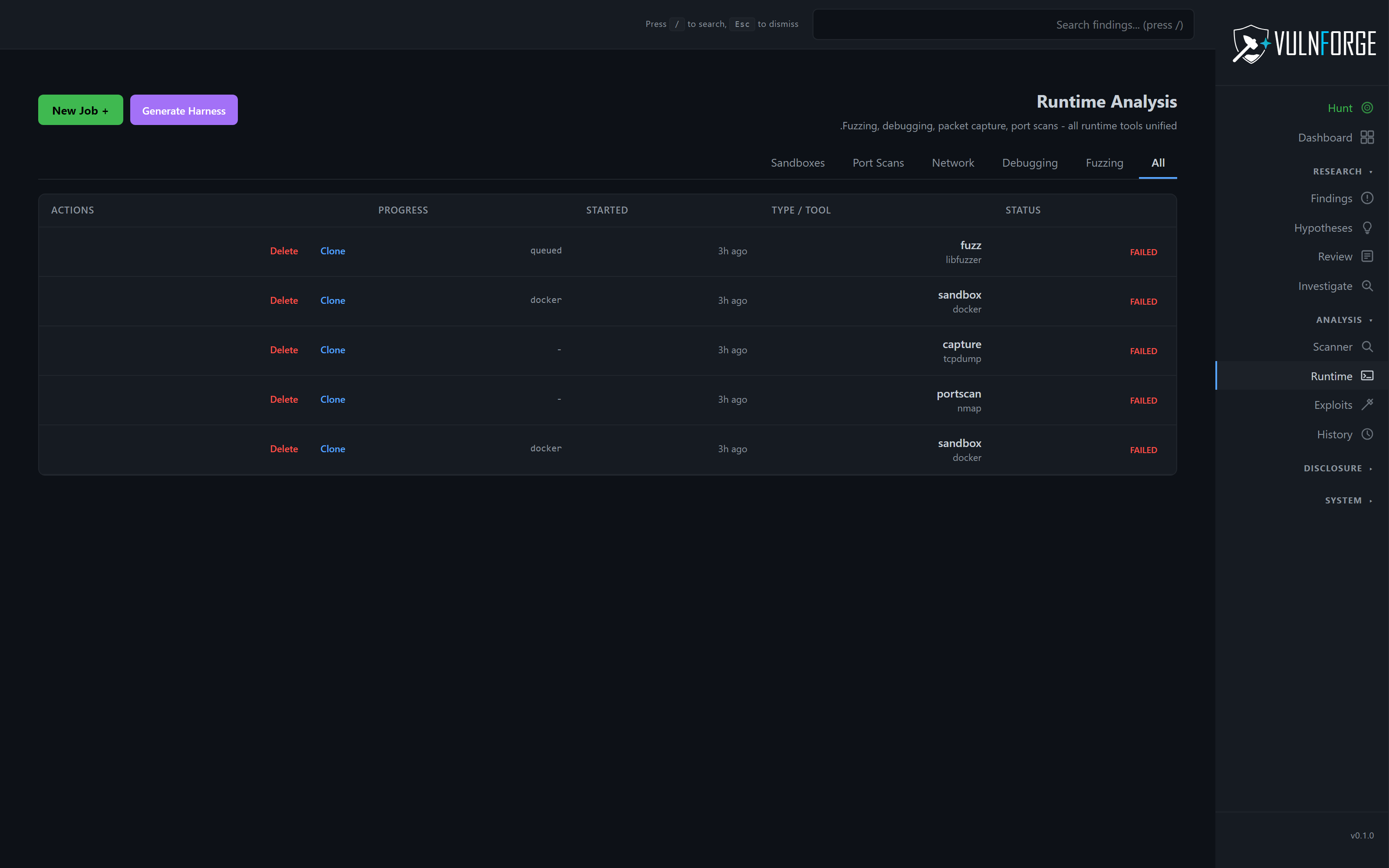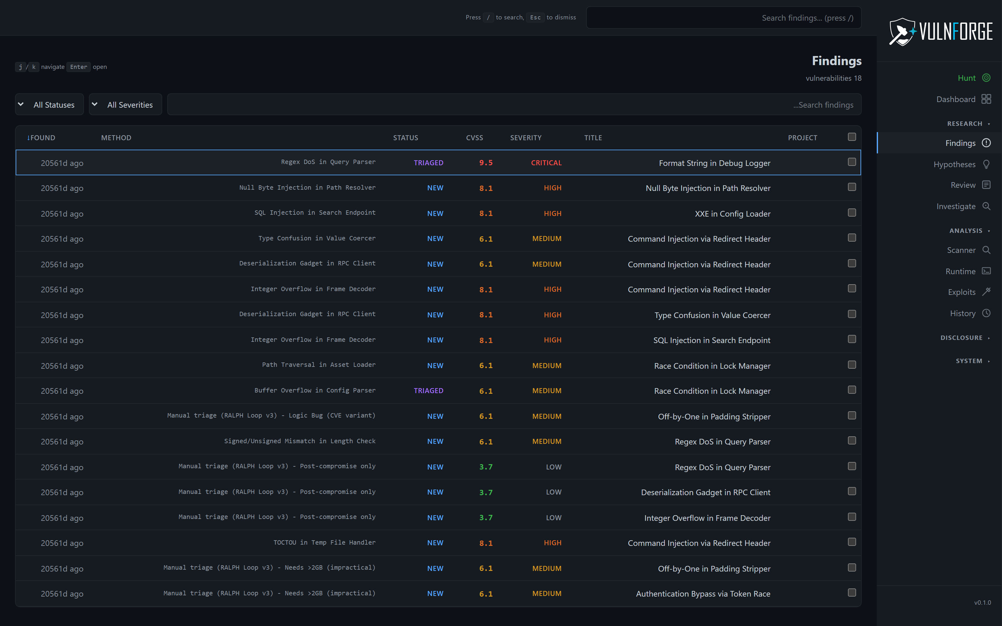 48 custom Python tools — memory safety, crypto, protocol, concurrency, supply chain — plus 10 integrated scanners: Semgrep, Trivy, CodeQL, Nuclei, Grype, OSV-Scanner, Bandit, Safety, Nettacker, Garak. Every finding flows through a 5-tier false-positive filter and optional AI triage.